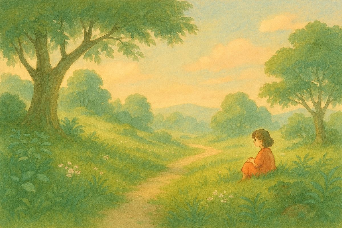 [Image: Soft, pastel-toned Ghibli-inspired landscape with Totoro-like warmth]